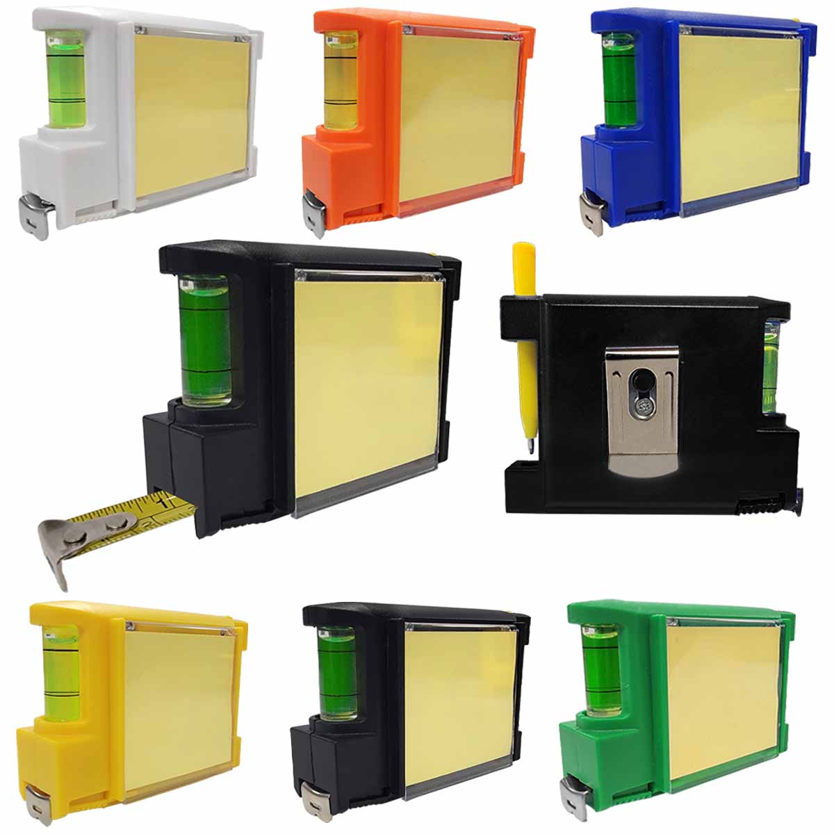 Popular multi-function tape measure...features a 10' retractable steel tape with a push button locking mechanism...Protective clear door flips up and down...Measures both in centimeters and inches...up to 10 feet (120 inches)...Also included is a mini notepad, a pen, a level and a belt clip... Size is approximately 3" x 2 1/4" x 1"... Available in Black, Blue, White, Orange, Green & Yellow...Perfect For Construction, Trade Shows, And Other Events...Extra Pads & Pens Available, Please See Options For Cost.